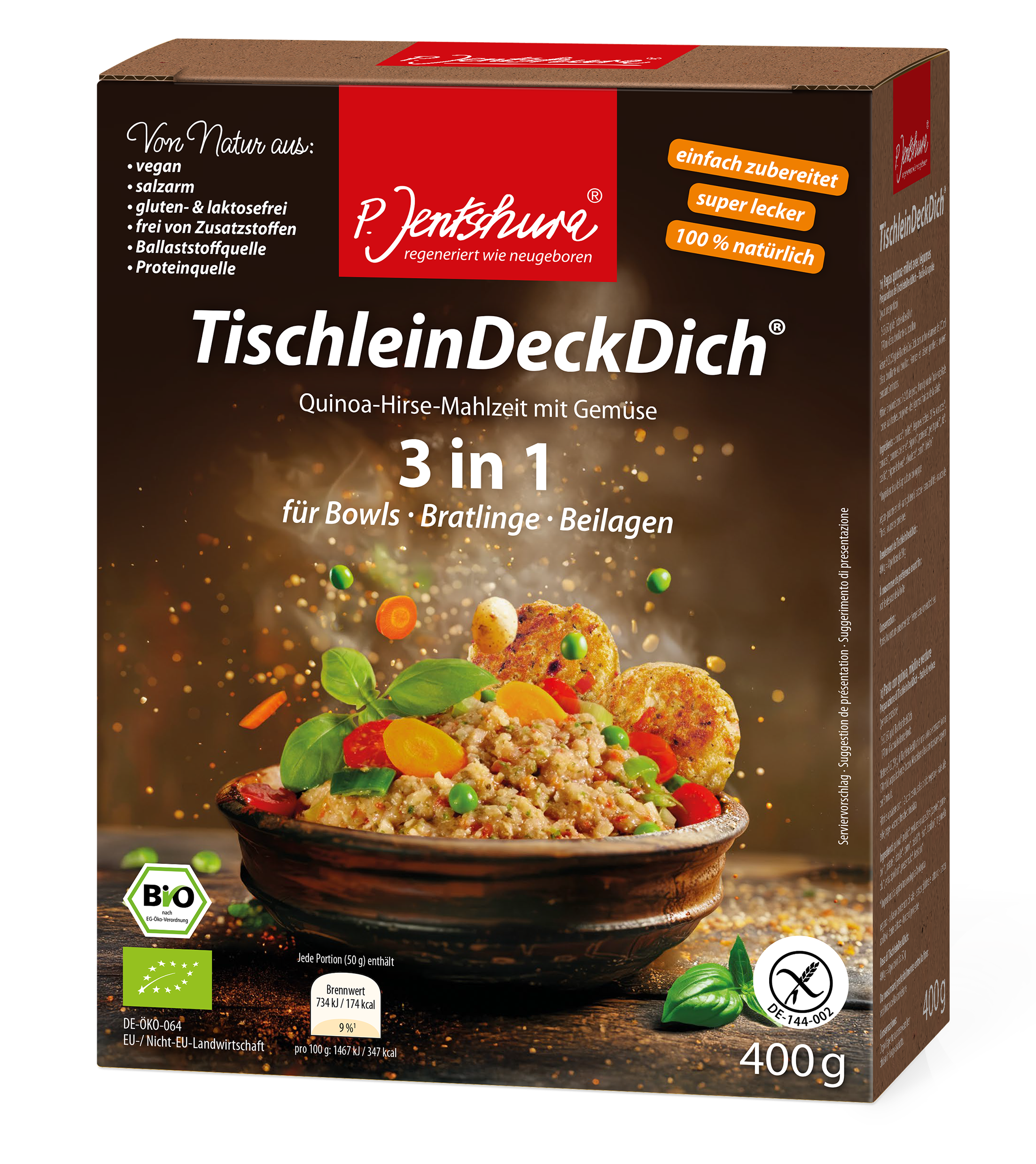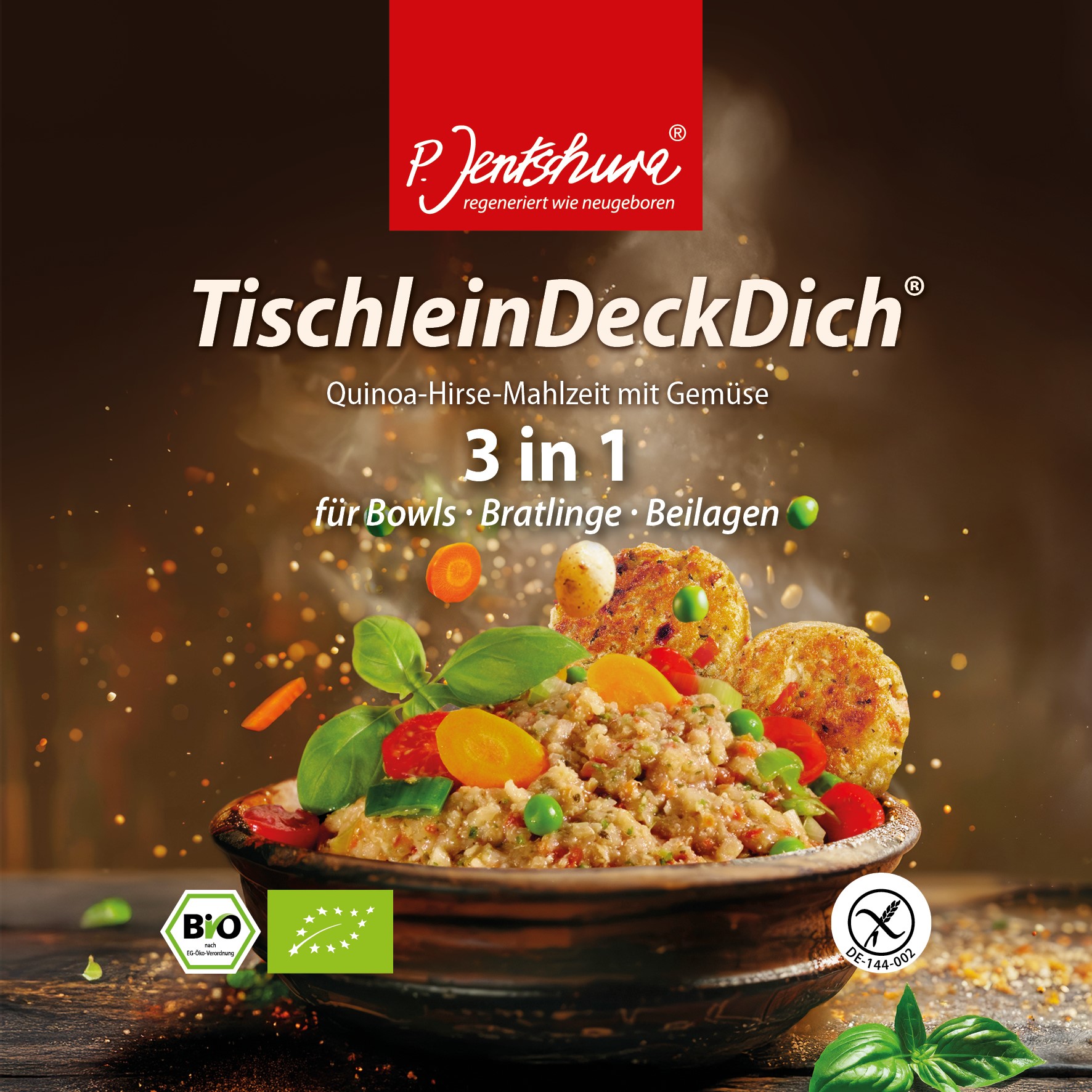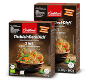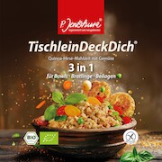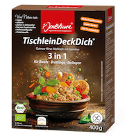 Zudem liefert die neue Verpackung Rezeptideen für leckere Bowls, Beilagen und Bratlinge. Die vielfältigen Variationen dienen als Haupt- oder Zwischenmahlzeit, zum Unterwegsverzehr für Berufstätige, Schulkinder sowie Outdoorbegeisterte und reichen von simpel bis fein. TischleinDeckDich kann als nährstoffreiche Beilage, als Gemüsefüllung oder als einfacher Bürosnack zubereitet werden. Das Produkt eignet sich optimal für Kitas, Schul- und Betriebskantinen sowie für viele weitere Einrichtungen mit Gemeinschaftsverpflegung, die auf hohe Qualität und besondere Nährstoffdichte setzen. Denn TischleinDeckDich ist zu 100 Prozent natürlich, glutenfrei und trägt das EU-Biosiegel.