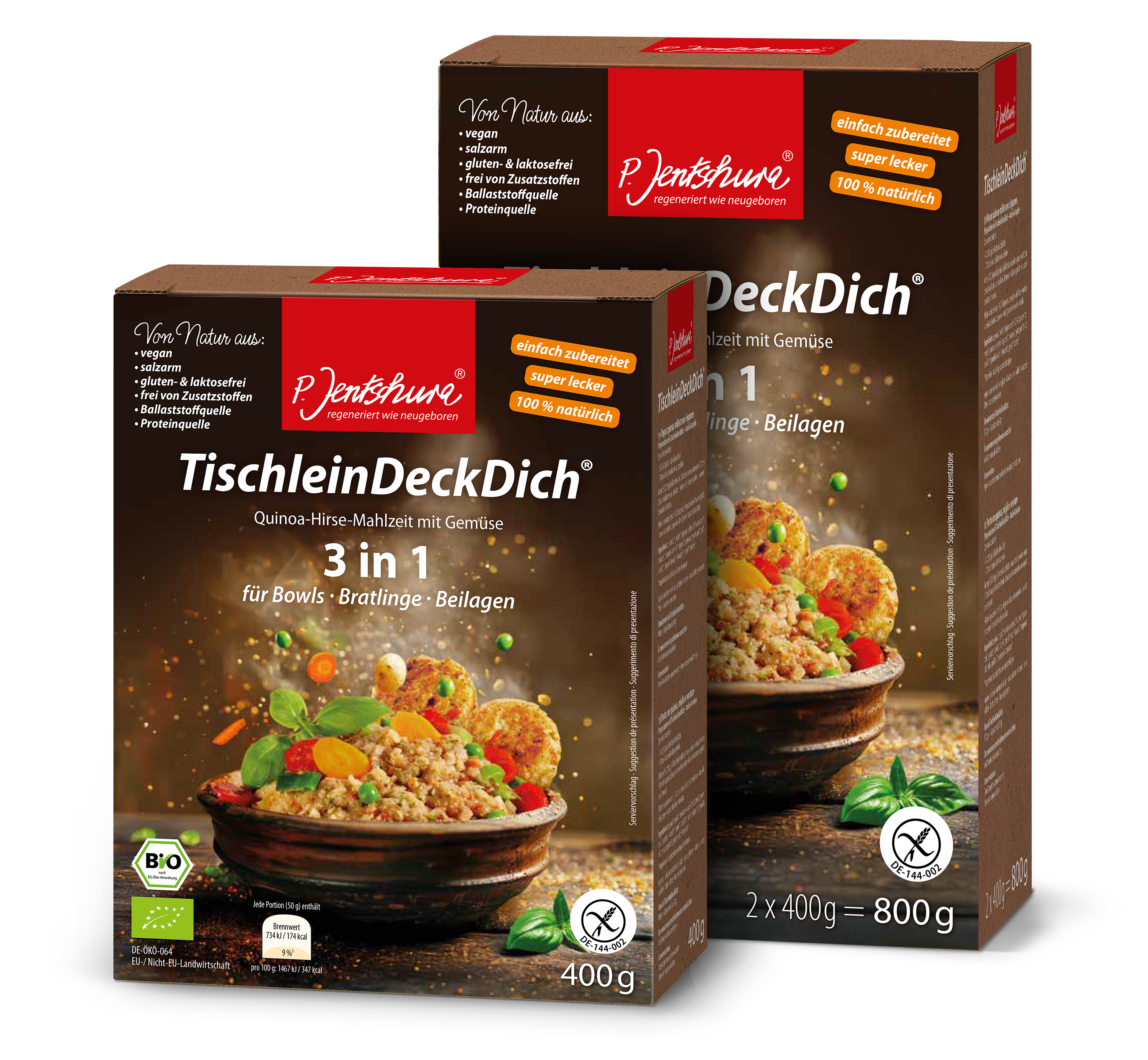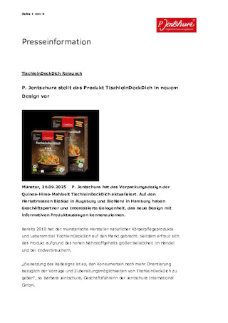 Münster, 26.09.2025 | P. Jentschura hat das Verpackungsdesign der Quinoa-Hirse-Mahlzeit TischleinDeckDich aktualisiert. Auf den Herbstmessen BioSüd in Augsburg und BioNord in Hamburg haben Geschäftspartner und Interessierte Gelegenheit, das neue Design mit informativen Produktaussagen kennenzulernen.