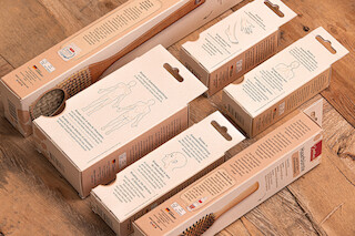 En plus de l'emballage écologique, toutes les caractéristiques importantes des brosses sont désormais visibles au premier coup d'oeil. Du matériau au mode d'emploi en passant par les conseils pratiques, vous trouverez toutes les informations dont vous avez besoin sur les boîtes en carton nouvellement conçues. Une découpe dans le carton apporte une pointe d’originalité. Jentschura : « Ainsi, avant d’acheter, chacun peut tester et toucher quel bois et surtout quels poils lui sont plus ou moins agréables. Pratiquement avec doigté. Rien ne s’oppose plus alors au bien-être !