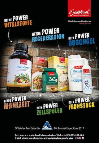 D’ailleurs, tous les aliments Jentschura sont parfaits pour l’expédition pour deux raisons selon M. Gröbner : « Ils contiennent les ingrédients indispensables à l’énergie qu’exige une situation extrême et ils sont, de plus, faciles à préparer. » En avril, le trekking démarre au Népal pendant quatre semaines, à travers des paysages difficiles tels que la région isolée du Rolwaling et celle reculée du Khumbu pour s’acclimater à la haute montagne, avant de commencer l’ascension du plus haut sommet du monde, sans oxygène artificielle et sans porteur.